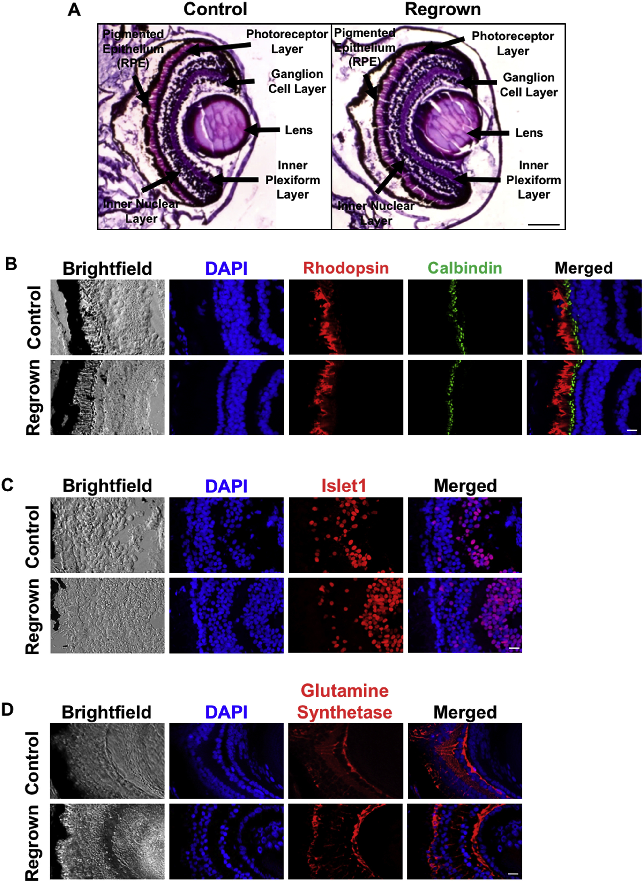 Regrown eye contains expected cell types. (A) Hematoxylin and eosin stained section of age-matched control (left panel) and regrown eyes at 5 dps (right panel). Regrown eye contains same eye structures compared to unoperated sibling control. (B-D) Identification of retinal cell types in eye regenerates. Dark pigmented tissue surrounding the retina is the retinal pigmented epithelium (RPE). (B) Eye sections stained with DAPI (DNA), anti-Rhodopsin antibody (rod photoreceptors), and anti-Calbindin-D-28K antibody (cone photoreceptors). (C) Eye sections stained with DAPI, anti-Isl1 antibody (identifies retinal ganglion cells, amacrine cells, bipolar cells, and horizontal cells). (D) Eye sections stained with DAPI, and anti-Glutamine Synthetase (Müller glia). (A-D) Upâ¯=â¯dorsal, downâ¯=â¯ventral. Scale bars: A-Dâ¯=â¯50â¯Î¼m.