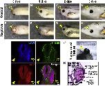 Tailbud embryos regrow eyes after tissue removal. Images showing normal eye development (A-D) and the eye regrowth process (E-H) starting with st. 27â¯at the following timepoints: immediately after surgery (0), 1, 2, and 5 days (dpsâ¯=â¯days post surgery). (A-D) Open arrowheads in the upper panels indicate control, unoperated eyes. (E-H) Closed arrowheads in the bottom panels indicate regrowing eyes. The rate of full eye regrowth (as shown in H and described in Supplemental Fig. 1) was approximately 93% (nâ¯=â¯63). (I) Images are immunostained, transverse sections through the eye plane after surgery. Closed arrowheads indicate surgery site, open arrowheads indicate unoperated eye. Blue color indicates nuclear staining (DAPI). Green color indicates the basal lamina (anti-Laminin), which outlines the optic vesicle. Red color indicates neural tissues (Xen1). (J) Eye tissues removed from a st. 27 embryo were transplanted to its flank at an incision site â¼1/2 from posterior end. By 5 dps, transplanted tissues have a retina and lens similar to the contralateral control eye (not shown) in the same embryo (nâ¯>â¯20). (K) Hematoxylin and eosin stained section of transplanted tissues at 5 dps. (A-H) Upâ¯=â¯dorsal, downâ¯=â¯ventral, leftâ¯=â¯anterior, rightâ¯=â¯posterior. (I) Upâ¯=â¯dorsal, downâ¯=â¯ventral. Scale bars: A-Hâ¯=â¯200â¯Î¼m, Iâ¯=â¯25â¯Î¼m, Jâ¯=â¯200â¯Î¼m, and Kâ¯=â¯50â¯Î¼m.