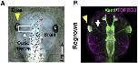 Regrown eye is connected by an optic nerve. (A) A dorsal view of the tadpolehead showing the locations of the eye, optic nerve, and brain. (B) The optic nerve of regrown eye (yellow arrowhead) innervates to the brain, similar to the contralateral, unoperated side. White arrow shows the optic nerve (green) as detected by the Xen1 antibody. Scale bars: A, Bâ¯=â¯250â¯Î¼m.