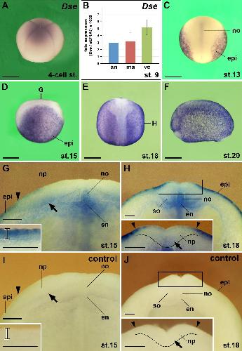 Xenopus embryos after whole-mount in situ hybridization in lateral view (A,D,F), dorsal view (C,E) and transversally sectioned through the anterior trunk (G-J). (A) Embryo at the 4-cell stage. Weak expression of Dse mRNA is visible. (B) qPCR analysis of embryonic explants at stage 9. Note Dse transcripts in the animal cap, marginal zone and vegetal region. (C) At stage 13, Dse is expressed in the epidermis and notochord. (D-F) Neurula embryos show ubiquitous Dse expression in the epidermis. The bold lines indicate the levels of sections in G and H. (G) Embryo at stage 15. The arrowhead indicates the border between epidermis and neural ectoderm. Note Dse transcripts in the sensorial layer of the lateral neural plate (arrow), notochord and dorsal endoderm. The bracket in the inset depicts the epidermis with robust Dse expression in the outer layer and lower mRNA levels in the inner layer. (H) Embryo at stage 18. Note Dse signals in the medio-ventral somites. The inset shows Dse expression in the sensorial layer of the ventral neural groove (arrow). The stippled line demarcates the border between the neural plate and the underlying dorsal mesoderm. (I,J) No signals appear in matching sections of sibling embryos that were probed with Dse sense RNA as control. an, animal cap; en, endoderm; epi, epidermis; ma, marginal zone; no, notochord; np, neural plate; so, somite; ve, vegetal region. Scale bars are 500 μm (A,C-F) and 50 μm (G-J).