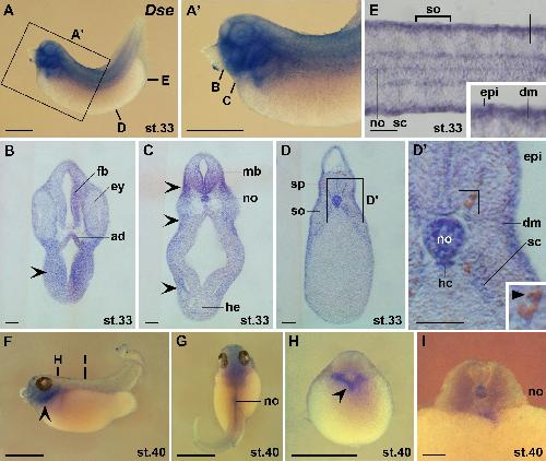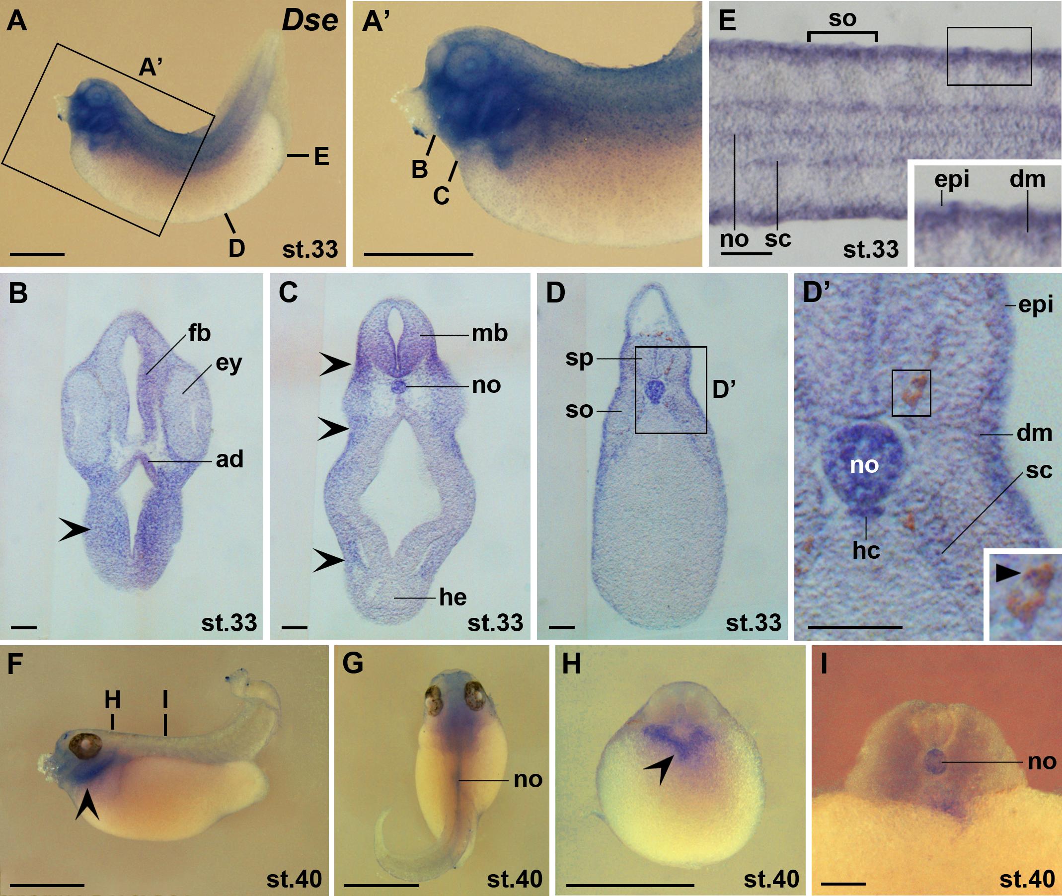 Embryos are shown in lateral view (A,Aâ,F), dorsal view (G), transversal sections (B-Dâ,H,I) and horizontal section (E). (A,Aâ) Embryo at stage 33. The bold lines indicate the level of sections in B-E. (B-E) Vibratome sections showing Dse expression in the adenohypophysis, forebrain, ventral midbrain, epidermis, notochord, hypochord, dermomyotome, and sclerotome. Note also Dse transcripts in cranial neural crest cells (indented arrowheads) and melanophores (filled arrowhead). (F-I) Embryo at stage 40. The bold lines indicate the level of sections in H and I. Dse is expressed in post-migratory cranial neural crest cells (indented arrowheads) and the notochord. ad, adenohypophysis; dm, dermomyotome; epi, epidermis; ey, eye; fb, forebrain; hc, hypochord; he, heart; mb, midbrain; no, notochord; sc, sclerotome; so, somite; sp, spinal cord. Scale bars are 1 mm (A,Aâ,F-H) and 100 μm (B-E,I).