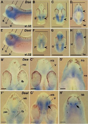 Embryos at stage 32 are shown in lateral views (A,E) and transversal sections (B-Dâ, F-Hâ). (A) Dse expression. The bold lines indicate the level of sections in B-D. (B-Dâ) Dse expression is found in the cranial neural crest (indented arrowheads). Note ventral expression domains in the forebrain, posterior midbrain, hindbrain, and notochord. Weak expression is visible in the trigeminal ganglia. (E) Dsel expression. The bold lines indicate the level of sections in F-H. (F-Hâ) Dsel expression appears in the cranial neural crest (indented arrowheads) and trigeminal ganglia. Note expression domain in the prechordal mesendoderm. Apparent are low-level transcripts in the entire ventral brain and robust bilateral expression domains in the ventral marginal zone of the mid- and hindbrain (arrows). fb, forebrain; hb, hindbrain; he, heart; mb, midbrain; no, notochord; pm, prechordal mesendoderm; V, trigeminal ganglion. Scale bars are 1 mm (A-H) and 200 μm (Bâ-Hâ).