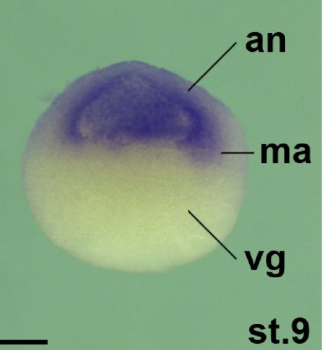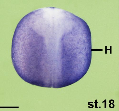dse (dermatan sulfate epimerase) gene expression in Xenopus laevis embryo, assayed via in situ hybridization, NF stage16, anterior view, dorsal up.