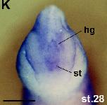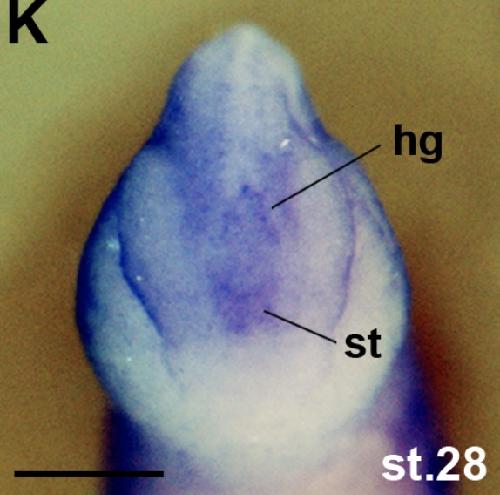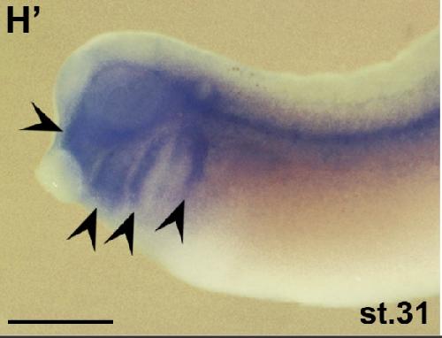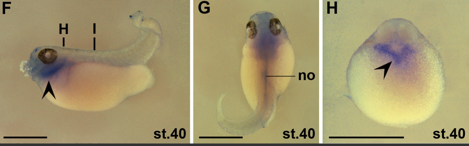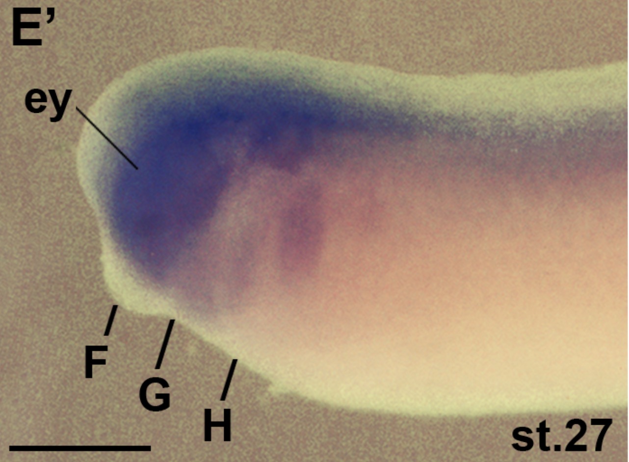 dse (dermatan sulfate epimerase) gene_symbol (gene_name) gene expression in Xenopus laevis embryo, assayed via in situ hybridization, NF stage 40, F lateral view, anterior right, dorsal up, G dorsal view and H, transverse section as indicated in F , through hindbrain and pharyngeal region.