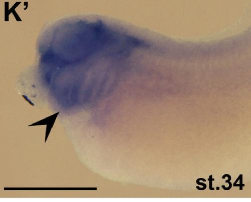 dsel (dermatan sulfate epimerase like) gene expression in Xenopus laevis embryo, assayed via in situ hybridization, NF stage 27, lateral view, anterior left, dorsal up.