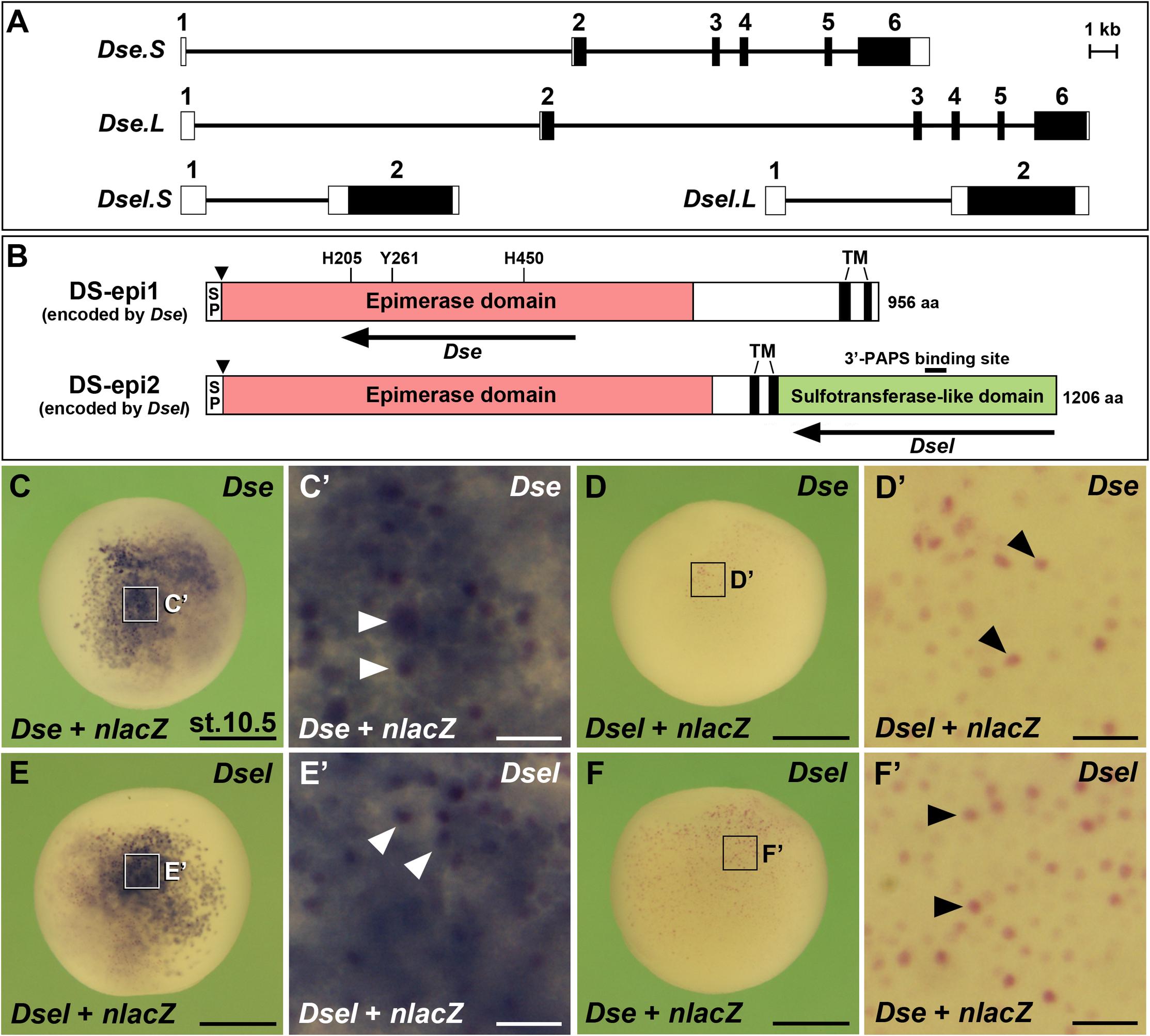 Fig 1. Genomic organization, protein structure and probe specificity of Dse/DS-epi1 and Dsel/DS-epi2 in X. laevis embryos. (A) Genomic structures of the Dse and Dsel homeologs. Rectangles with numbers show exons and intervening lines demarcate introns. Filled boxes indicate open reading frames. Accession numbers of the Xenopus laevis genomic DNA / mRNA sequences are: DS-epi1.S, NC_030733 / KU877109; DS-epi1.L, NC_030732 / XM_018263281; DS-epi2.S, NC_030735 / XM_018223616; DS-epi2.L, NC_030734 / KU877110. (B) Overall protein structure of DS-epi1 and DS-epi2, which are encoded by Dse and Dsel, respectively. SP, cleavable signal peptide; TM, transmembrane domain. The arrows represent the antisense RNA probes of Dse and Dsel that were used for the in situ hybridization. (C-Fâ) Whole-mount in situ hybridization of early gastrula embryos in lateral view. The Dse probe detects injected Dse mRNA (C,Câ) but not Dsel mRNA (D,Dâ). The Dsel probe specifically targets injected Dsel mRNA (E-Fâ). Arrowheads depict cells that received co-injected nlacZ mRNA as a lineage tracer (red nuclei). Each synthetic mRNA was injected at a dose of 100 pg into the animal pole of a single blastomere at the 4-cell stage. Scale bars are 500 μm (C-F) and 50 μm (Câ-Fâ).