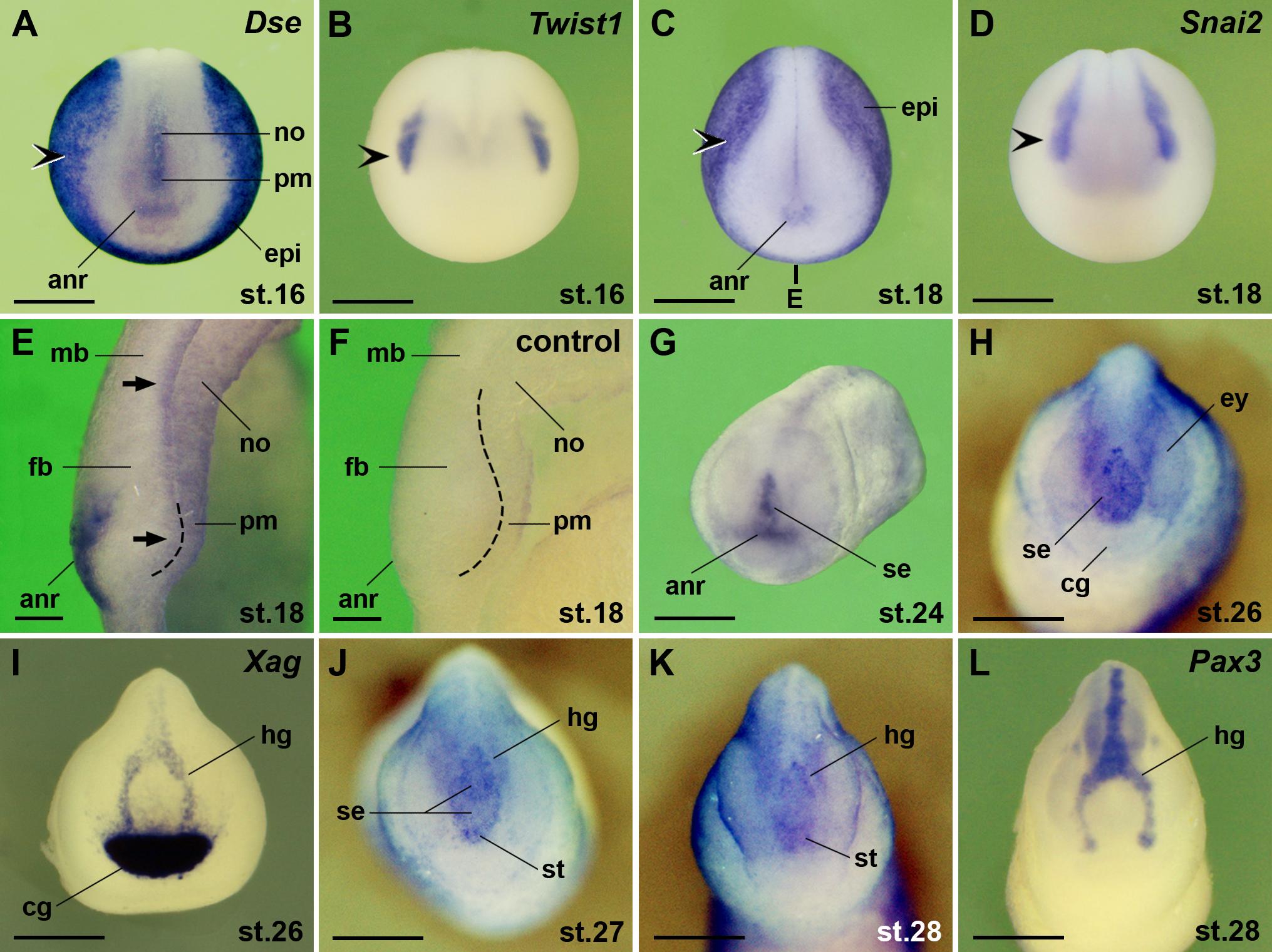 Fig 3. Dse is expressed in the pre-migratory neural crest, anterior surface ectoderm, brain, and prechordal mesendoderm.