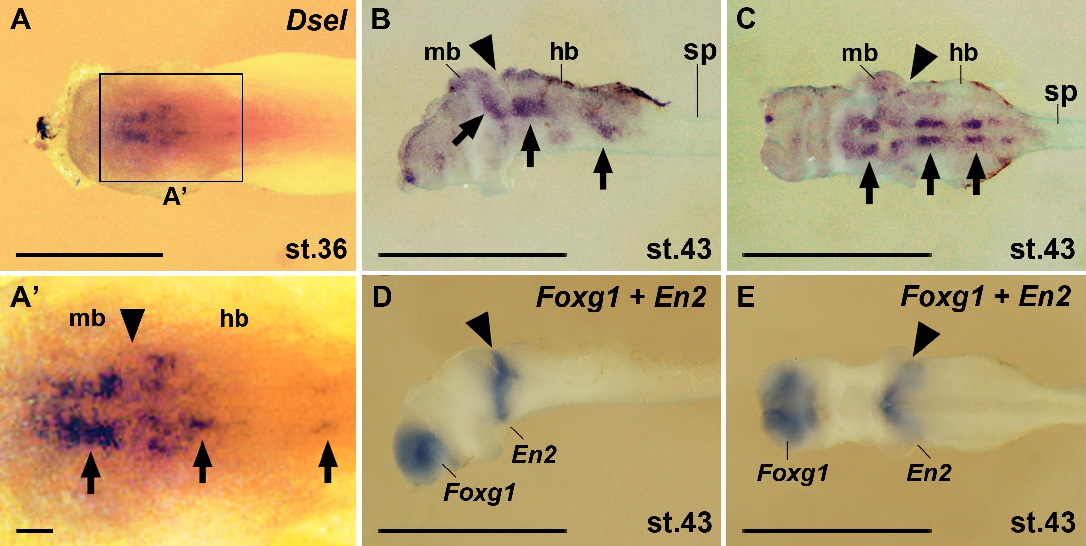 Specimen after whole-mount in situ hybridization are shown in dorsal view (A,Aâ), lateral view (B,D) and ventral view (C,E). (A,Aâ) Embryo at stage 36. Arrows label distinct Dsel expression domains in the midbrain and hindbrain. The arrowhead labels the position of the midbrain-hindbrain boundary. (B-E) Isolated central nervous system from stage 43 embryos after removing of surrounding tissues. Dsel mRNA accumulates in bilateral domains in the brainstem (arrows). Expression of Foxg1 demarcates the forebrain and En2 the midbrain-hindbrain isthmus (arrowhead). hb, hindbrain; mb, midbrain; sp, spinal cord. Scale bars are 1 mm (A-E) and 100 μm (Aâ).