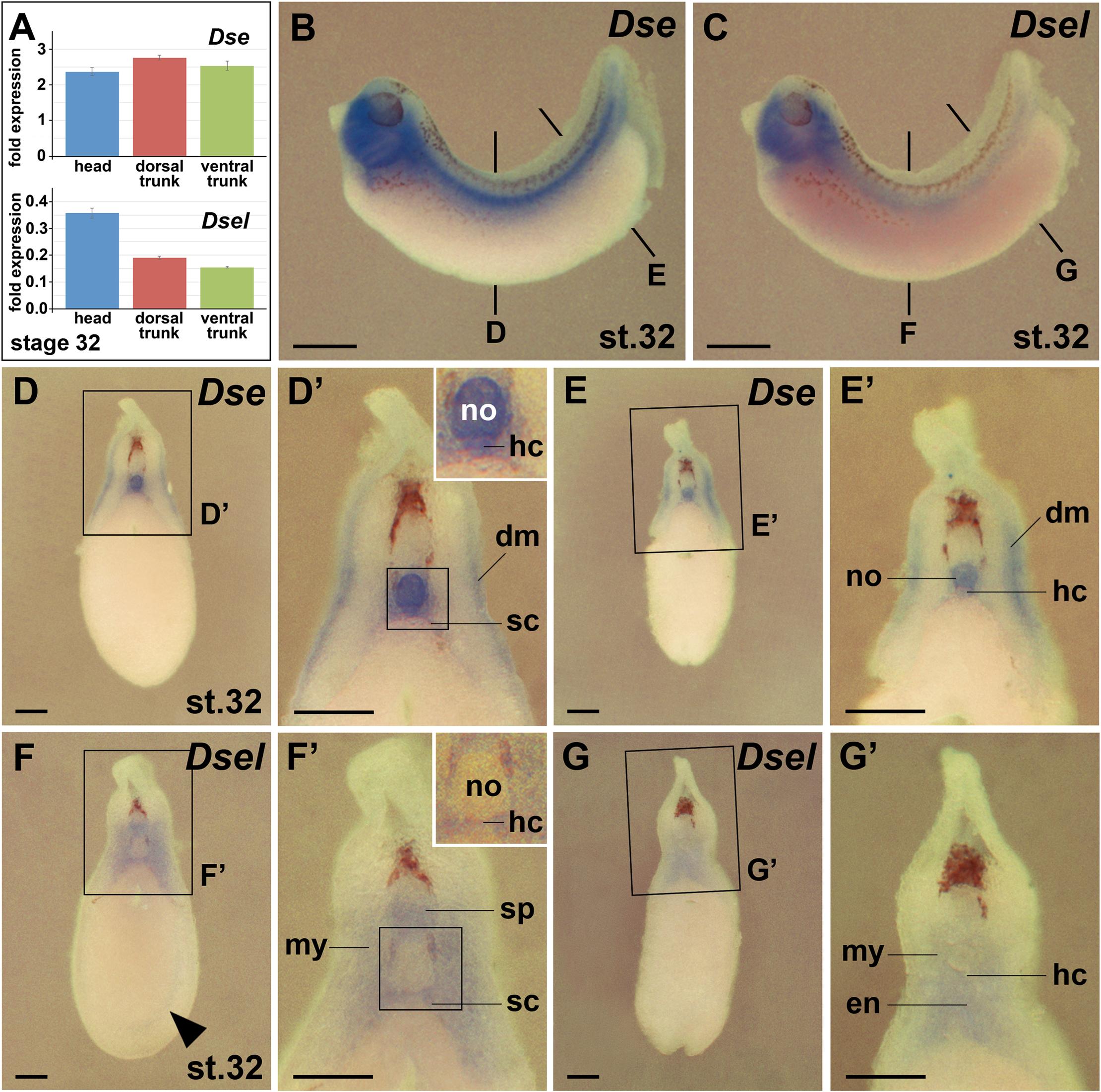 Embryos at stage 32 are shown in lateral views (B,C) and transversal sections (D-Gâ) after whole-mount in situ hybridization. (A) qPCR analysis of embryonic explants at stage 32. The numbers on the y-axis indicate fold expression of (Dse / eEF1A1) x 1000 (top) and (Dsel / eEF1A1) x 1000 (bottom). Note equal distribution of Dse transcripts in the head, dorsal trunk and ventral trunk. Dsel mRNA is most abundant in the head and is expressed at comparable levels in the dorsal and ventral trunk. (B) Dse expression. The bold lines indicate the level of sections in D and E. (D-Eâ) Dse expression is detected in the notochord, dermatome, sclerotome and hypochord (inset). (C) Dsel expression. The bold lines indicate the level of sections in F and G. (F-Gâ) Dsel expression appears in the ventral spinal cord, migrating trunk neural crest cells (arrowhead), myotome, sclerotome, hypochord (inset) and posterior dorsal hindgut endoderm. dm, dermatome; en, endoderm; hc, hypochord; my, myotome; no, notochord; sc, sclerotome; sp, spinal cord. Scale bars are 1 mm (B,C) and 200 μm (D-Gâ).