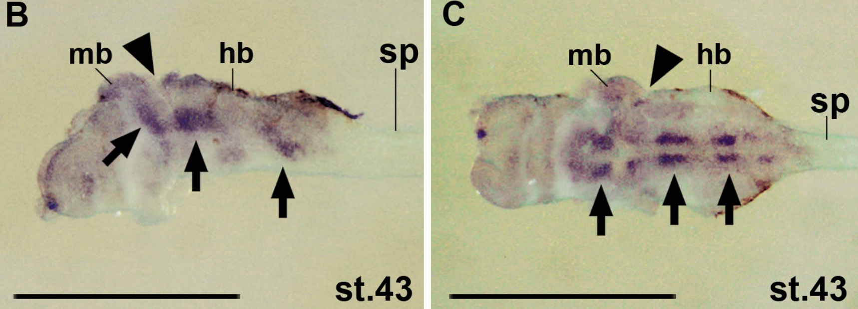 dsel (dermatan sulfate epimerase like) gene expression in Xenopus laevis tadpole brain, assayed via in situ hybridization, NF stage 43, B: lateral view, anterior left, dorsal up; C dorsal view, anterior left.