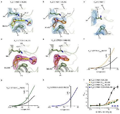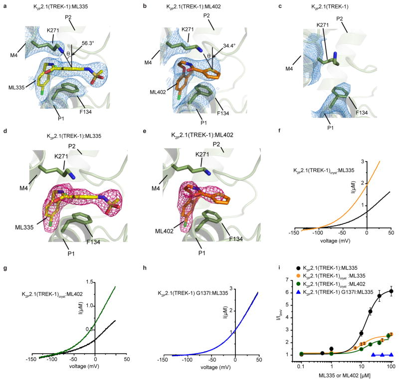 Extended Data Figure 2. K2P2.1(TREK-1)cryst modulator binding pocket densities and K2P2.1(TREK-1)cryst functional propertiesa–e, Exemplar electron densities for the modulator binding pockets. a–c, 2Fo-Fc densities (blue) for a, K2P2.1(TREK-1):ML335 (1.5 σ), b, K2P2.1(TREK-1):ML402 (1.0 σ), and c, K2P 2.1(TREK-1) (1.0 σ). Offset angle for the cation-π interactions for Lys271:ML335 and Lys271:ML402 is shown and adopts an oblique geometry common to cation-π interactions35,36. d, and e, Fo-Fc densities (hotpink, 3.0 σ) for d, K2P2.1(TREK-1):ML335 and e, K2P2.1(TREK-1):ML402. Final models are shown in all panels and select residues are shown and labeled. f–h, Exemplar current traces for f, K2P2.1 (TREK-1)cryst (black) with 40 μM ML335 (yellow orange), g, K2P2.1 (TREK-1)cryst (black) with 80 μM ML402 (green), and h, K2P2.1 (TREK-1) G137I (black) with 80 μM ML335 (blue). i, Dose response curves for K2P2.1(TREK-1):ML335 (black), EC50=14.3 ± 2.7 μM (n≥5); K2P2.1 (TREK-1)cryst:ML335, EC50 = 10.5 ± 2.7 μM (n≥3) (yellow orange) K2P2.1 (TREK-1)cryst:ML402, EC50 = 14.9 ± 1.6 μM (n≥3); and K2P2.1(TREK-1) G137I:ML335 (blue ).