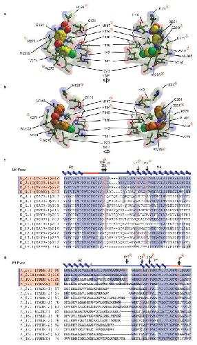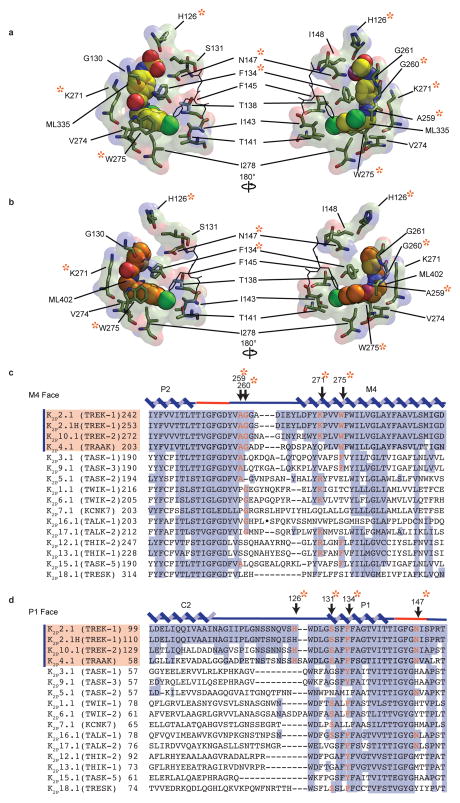 Extended Data Figure 4. K2P modulator pocket structure and conservationDetails of a, ML335, and b, ML402 interactions with K2P2.1(TREK-1). c and d, Representative K2P channel sequence comparisons for the c, M4 face and d, P1 face. Purple bar and orange shading on sequence identifiers denotes the thermo- and mechanosensitive K2P2.1(TREK-1) subfamily. Protein secondary structure is marked above the sequences. Selectivity filter region is in red. Residues involved in direct interactions with ML335 and ML402 are orange and marked with an orange asterisk. Conserved positions are highlighted. K2P2.1(TREK-1) is the mouse protein used for this study. K2P2.1H(TREK-1) is the human homolog. All other K2P sequences are human origin. Sequences and identifiers are as follows: K2P2.1(TREK-1) NP_034737.2; K2P2.1H(TREK-1), NP_001017424.1; K2P10.1(TREK-2), NP_612190.1; K2P4.1(TRAAK), NP_001304019.1; K2P3.1(TASK-1), NP_002237.1; K2P9.1(TASK-3), NP_001269463.1; K2P5.1(TASK-2), NP_003731.1; K2P1.1(TWIK-1), NP_002236.103812.2; K2P6.1(TWIK-2), NP_004823.1; K2P7.1(KCNK7), AAI03812.2; K2P16.1(TALK-1), NP_001128577.1; K2P17.1(TALK-2), NP_113648.2; K2P12.1(THIK-2), NP_071338.1; K2P12.1(THIK-1), NP_071337.2; K2P15.1(TASK-5), NP_071753.2; and K2P18.1(TRESK), NP_862823.1. ‘●’ in K2P16.1(TALK-1) sequence in ‘c’ denotes the following, non-conserved sequence that was removed to avoid a long alignment gap: NFITPSGLLPSQEPFQTPHGKPESQQIP.