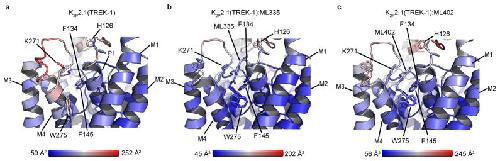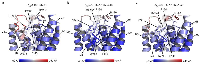 Extended Data Figure 5. K2P structure comparisonsK2P modulator pocket views colored by B-factor for a, K2P2.1(TREK-1), b, K2P2.1(TREK-1):ML335, and c, K2P2.1(TREK-1):ML402. Bars show B-factor scale.