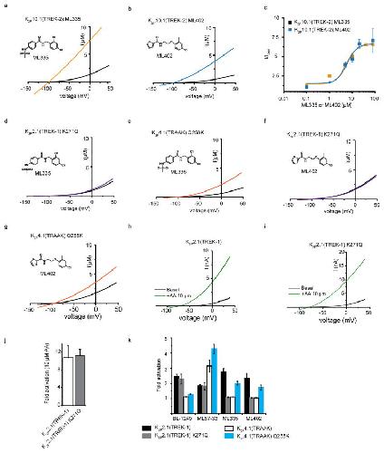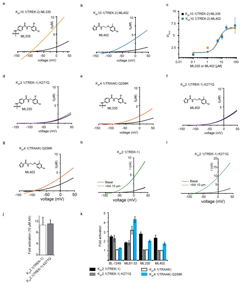 Extended Data Figure 7. K2P activator responsesExemplar current traces for a, K2P10.1(TREK-2) (black) with 20 μM ML335 (yellow orange) and b, K2P10.1(TREK-2) (black) with 20 μM ML402 (cyan). c, Dose response curves for K2P10.1(TREK-2) with ML335 (EC50 = 5.2 ± 0.5 μM (n>3)) (yellow orange) and ML402 (EC50 = 5.9 ± 1.6 μM (n≥4)(cyan). Exemplar current traces for d, K2P2.1(TREK-1) K271Q (black) and with 20 μM ML335 (purple). e, K2P4.1(TREK-1) Q258K (black) and with 50 μM ML335 (orange). f, K2P2.1(TREK-1) K271Q (black) and with 50 μM ML402 (purple). g, K2P4.1(TREK-1) Q258K (black) and with 50 μM ML402 (orange). Currents were evoked from Xenopus oocytes expressing the indicated channels from a −80 mV holding potential followed by a 500 ms ramp from −150 mV to +50 mV. Compound structures are shown. h, and i, Exemplar current traces for HEK293 cell inside-out patches expressing h, K2P2.1(TREK-1) and i, K2P2.1(TREK-1) K271Q to stimulation by 10 μM arachidonic acid (AA) (green). j, Current potentiation measured in HEK cells at 0 mV in response to 10μM AA for K2P2.1(TREK-1) (n=5) and K2P2.1(TREK-1) K271Q (n=4). k, Current potentiation measured in Xenopus oocytes at 0 mV for K2P4.1(TRAAK) (white), K2P2.1(TREK-1) (black), K2P4.1(TRAAK) Q258K (cyan) and K2P2.1(TREK-1) K271Q (gray) in response to 10 μM BL-1249, 30 μM ML67-33, and 20 μM ML335. For all experiments (n≥4). Data are mean ± SEM.