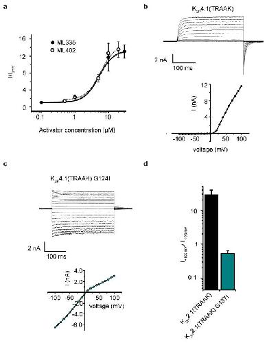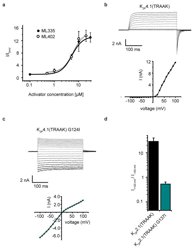 Extended Data Figure 8. K2P channel patch clamp recordingsa, Dose response for K2P2.1(TREK-1) to ML335 (black circles) and ML402 (open circles) measured in HEK293 cells by whole cell patch clamp. EC50 values are 5.2 ± 0.8 μM and 5.9 ± 1.6 μM for ML335 and ML402, respectively (n≥3). b, and c, Representative current traces and voltage-current relationship from HEK293 inside-out patches for expressing b, K2P4.1(TRAAK) and c, K2P4.1(TRAAK) G124I elicited by a 350 ms-voltage step protocol from −100 mV to +100 mV in 150 mM K+[out]/150 mM Rb+[in]. d, Rectification coefficients (I+100mV/I-100mV) calculated from n≥3 current recordings obtained from the same conditions in ‘b’ and ‘c’.