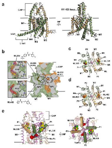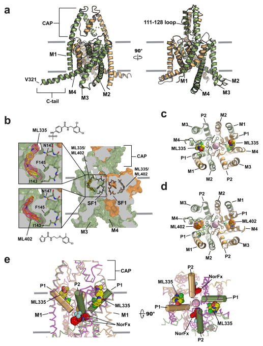 Figure 1. K2P2.1(TREK-1) structuresa, K2P2.1(TREK-1)cryst cartoon (smudge and light orange) smudge subunit extracellular cap domain (CAP), M1–M4 transmembrane helices, C-tail, and V321 are labeled. b, K2P modulator pocket cutaway. Cutouts display ML335 and ML402 Fo-Fc densities (3.0σ). ML335, ML402, and Selectivity Filter 1 (SF1) are sticks. c, and d, Extracellular views excluding the CAP domain of c, ML335 and d, ML402 binding sites. ML335 and ML402 are space filling. Selectivity filter sidechains are sticks. e, Wire representation comparing K2P2.1(TREK-1):ML335 (smudge and light orange) and K2P10.1(TREK-2):norfluoxetine6 (light pink and magenta) binding sites. K2P2.1(TREK-1) P1 and P2 are cylinders. ML335 (yellow) and norfluoxetine (NorFx) (red) are space filling. In all panels select residues and channel elements are indicated, and where present, grey lines indicate the membrane.