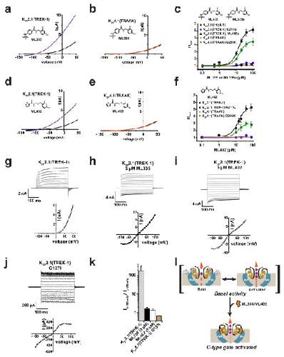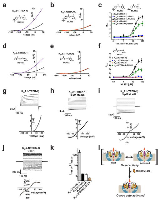 Figure 4. K2P2.1(TREK-1) activator functionExemplar current traces for a, K2P2.1(TREK-1) (black) with 20 μM ML335 (purple). b, K2P4.1(TRAAK) (black) with 50 μM ML335 (orange). c, ML335 dose response curves for K2P2.1(TREK-1) (black), EC50=14.3 ± 2.7 μM (n≥5); K2P2.1(TREK-1) K271Q (blue filled circles); K2P4.1(TRAAK) (orange); K2P4.1(TRAAK) Q258K (green) EC50=16.2 ± 3.0 μM (n≥4); and ML335a: K2P2.1(TREK-1) (black open triangles). Exemplar current traces for d, K2P2.1(TREK-1) (black) with 20 μM ML402 (purple). e, K2P4.1(TRAAK) (black) with 50 μM ML335 (orange). f, ML402 dose response curves for K2P2.1(TREK-1) (black), EC50=13.7 ± 7.0 μM (n≥3); K2P2.1(TREK-1) K271Q (blue); K2P2.1(TREK-1) (blue); K2P4.1(TRAAK) (orange); K2P4.1(TRAAK) Q258K (green) EC50=13.6 ± 1.5 μM (n≥3). g–j, Exemplar current traces and voltage-current relationships for indicated K2Ps in HEK293 inside-out patches in 150 mM K+[out]/150 mM Rb+[in] for g, K2P2.1(TREK-1), h, K2P2.1(TREK-1) with 5 μM ML335, I, K2P2.1(TREK-1) with 5 μM ML402, and j, K2P2.1(TREK-1) G137I. k, Rectification coefficients (I+100mV/I–100mV) from recordings (n≥3) made in ‘g–j’. l, TREK activation model. Grey lines indicate mobile P1 (tan) and M4 (blue). C-type activators (orange), stabilize the selectivity filter and channel ‘leak mode’. Potassium ions are purple. Gap in arrows indicates current flow intensity. Membrane is grey.