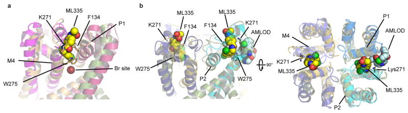 Extended Data Figure 3. Comparison of K2P modulator and VGIC antagonist sitesa, Superposition of the K2P2.1(TREK-1):ML335 complex (smudge and light orange) with the BacNaV ‘pore-only’ NaVMs structure18 (magenta and warm pink). Bromine site (Br) from labeled sodium channel antagonists is shown as a firebrick sphere. b, Superposition of the pore domains of the K2P2.1(TREK-1):ML335 complex (smudge and light orange) with the pore domain of the BacNaV CaVAb (5KMD) bound to the inhibitor amlodipine (AMLOD)19, a site normally occupied by lipid19,37. Select residues of the K2P modulator pocket are shown as sticks and are labeled. CaVAb subunits are colored cyan, marine, slate, and dark blue. ML335 (yellow) and amlodipine (cyan) are shown in space filling representation.