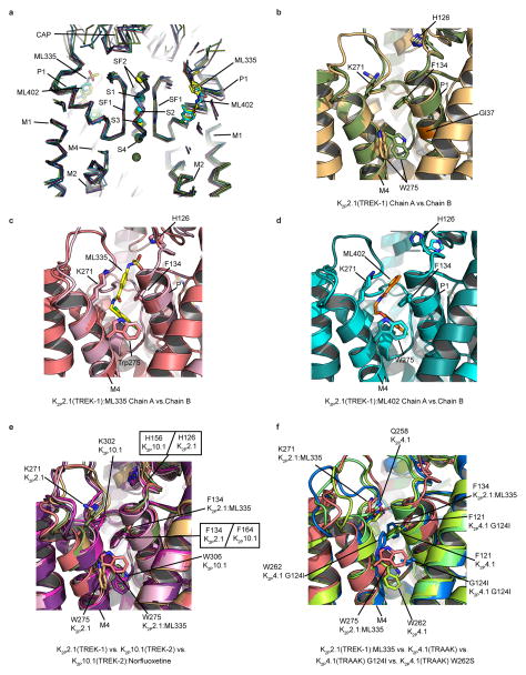 Extended Data Figure 6. K2P structure comparisonsa, Backbone atom superposition of K2P2.1(TREK-1) (smudge, up), K2P2.1(TREK-1):ML335 (yellow, up), K2P2.1(TREK-1):ML402 (cyan, up), K2P10.1(TREK-2) (4BW5) (pink, up)6, K2P10.1(TREK-2) (4XDJ) (magenta, down)6, K2P10.1(TREK-2):Norfluoxetine (4XDK)(violet purple, down)6, K2P4.1(TRAAK) (4I9W) (limon, up)13, K2P4.1(TRAAK) G124I (4RUE) (marine, down)15, and K2P4.1(TRAAK) W262S (4RUF) (lime, down)15. ‘up’ or ‘down’ denotes M4 conformation. Selectivity filter ions for K2P2.1(TREK-1) (smudge), K2P2.1(TREK-1):ML335 (yellow), and K2P2.1(TREK-1):ML402 (cyan) are shown as spheres. ML335 and ML402 are shown in sticks. Select channel elements are labeled. b–e, Superposition showing b, K2P2.1(TREK-1) chain A (smudge) and chain B (light orange). Sites of GOF mutations, G137I (orange)7, and Trp2758, are indicated. c, K2P2.1(TREK-1):ML335 chain A (pink) and chain B (deep salmon), d, K2P2.1(TREK-1):ML402 chain A (cyan) and chain B (deep teal). e, K2P2.1(TREK-1) chain A (smudge) and chain B (light orange), K2P10.1(TREK-2) (4BW5) (pink)6, K2P10.1(TREK-2) (4XDJ) (magenta)6, K2P10.1(TREK-2):Norfluoxetine (4XDK)(violet purple)6. f, K2P2.1(TREK-1):ML335 (deep salmon), K2P4.1(TRAAK) (4I9W) (limon)13, K2P4.1(TRAAK) G124I (4RUE) (marine)15, K2P4.1(TRAAK) W262S (4RUF) (lime)15. G124I from K2P4.1(TRAAK) G124I15 is shown in sticks. In b–f, Phe134, His126, Lys271, Trp275, their equivalents in K2P10.1(TREK-2), K2P4.1(TRAAK), and K2P4.1(TRAAK) G124I, are shown in sticks. ML335, ‘c’, and ML402, ‘d’, are shown as sticks.