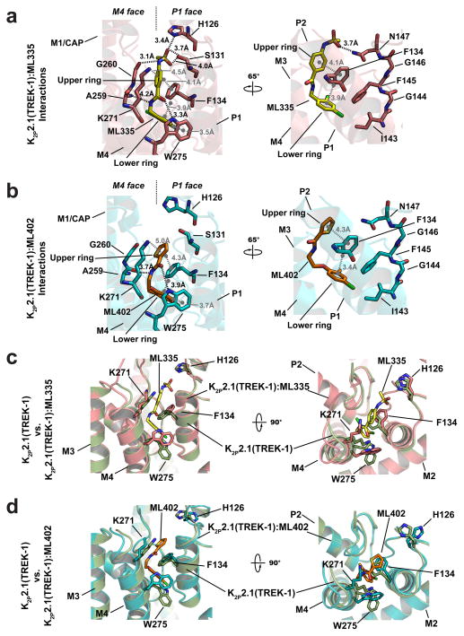 Figure 2. K2P2.1(TREK-1) activator interactionsCartoon diagram of a, K2P2.1(TREK-1):ML335 and b, K2P2.1(TREK-1):ML402 interactions. Electrostatic and hydrogen bond interactions are black. Cation-π and π-π interactions are grey. c, and d, comparison of K2P2.1(TREK-1) (smudge) with c, K2P2.1(TREK-1):ML335 (deep salmon) and d, K2P2.1(TREK-1):ML402 (cyan).
