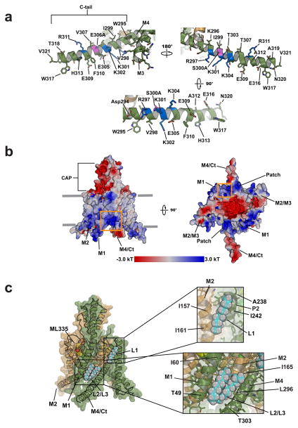 Figure 3. K2P2.1(TREK-1) C-tail and lipid binding sitesa, K2P2.1(TREK-1) C-tail. Positively charged residues are blue. S300A and E306A, a site having slight distortion from helical geometry, are magenta. b, K2P2.1(TREK-1) Electrostatic surface potential. Orange box highlights M1/M2/M4 junction. Cytoplasmic view (left) indicates C-tail positively charged patch. c, Lipids L1, L2, and L3 (cyan and white) shown as space filling. ML335 (yellow) is indicated. Insets show lipid binding pocket details.