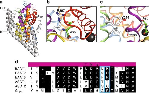 Fig. 1. The structure of a GltPh protomer, and sequence alignments of ASCTs and EAATs and GltPh
