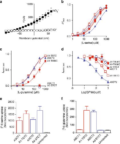 Fig. 2. Mutations in ASCT1 and ASCT2 affect substrate and inhibitor selectivity a Current–voltage relationships elicited by 300 µM L-serine in Cl−-containing buffer (open squares) and NO3