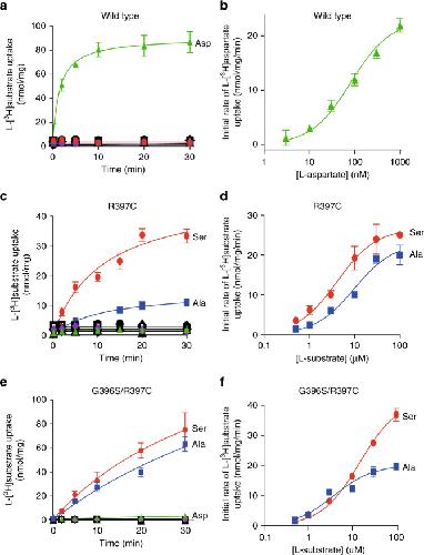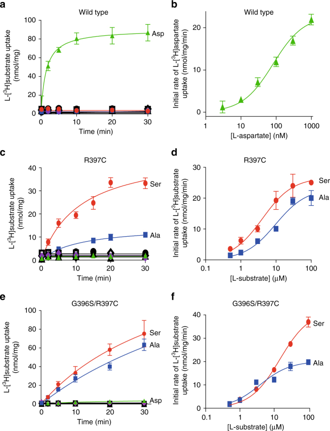 a, GltPh-R397C c and GltPh-G396S/R397C e in the presence of an inwardly directed Na+ gradient at pH 7.5. Uptake of each substrate in the absence of a Na+ gradient is shown in open, black symbols, of which multiple are overlayed. b L-[3H]aspartate concentration–response for wild-type GltPh. L-[3H]serine (red circles) and L-[3H]alanine (blue squares) concentration responses are shown for GltPh-R397C d and GltPh-G396S/R397C f. Values presented are mean ± S.E.M, (n ≥ 3)