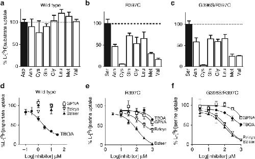 Fig. 4. Neutral amino acid and inhibitor selectivity in wild-type and mutant GltPh Initial rates of uptake in the presence of 100 nM L-[3H]aspartate (black bar) for wild type a or 10 µM L-[3H]serine (black bars) for GltPh-R397C b and GltPh-G396S/R397C c and 100-fold unlabelled competitor as indicated on the x-axis (white bars). Values are normalised to initial rates of L-[3H]substrate uptake alone, n = 3 ± SEM. Concentration–response curves are shown for TBOA (closed circles), benzylserine (closed triangles), benzylcysteine (open triangles) and GPNA (open squares) in wild-type GltPh