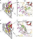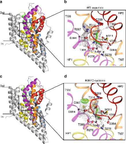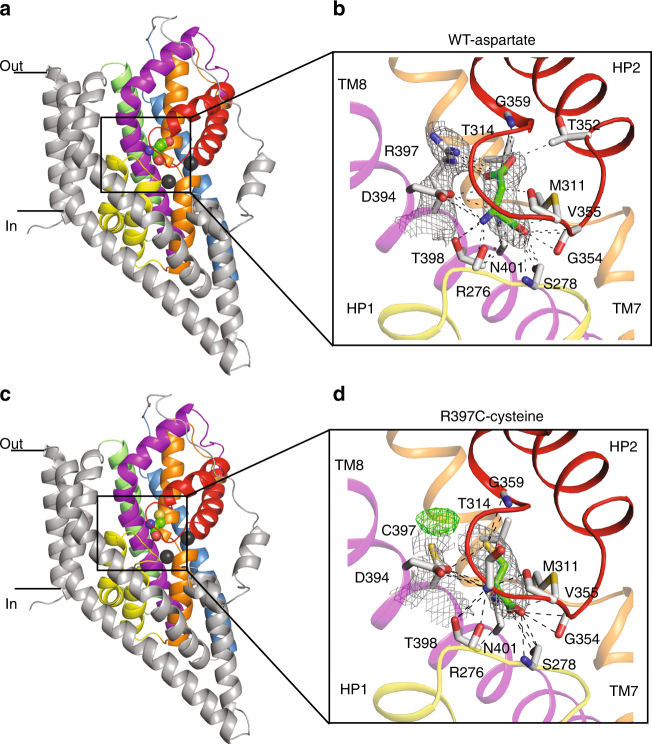 Fig. 5. Substrate-binding site in wild-type and mutant GltPh View of a single protomer of the wild-type GltPh bound to L-Aspartate a and GltPh-R397C bound to L-Cysteine c. The protomer is divided into the ‘scaffold domain’ (TM1, TM2, TM4 and TM5, coloured in grey) and the ‘transport domain’ (TM3 in blue, TM6 in green, TM7 in orange, TM8 in magenta, HP1 in yellow and HP2 in red). Bound substrate is shown in stick representation and Na1 and Na2 are shown as dark grey spheres. Close-up view of the L-Aspartate b and the L-Cysteine d binding sites, respectively. Interactions within 3.5 Å between bound substrate and residues in the GltPh-binding site are shown as dashed lines. Averaged 2fo–fc electron density maps at 1σ are shown in dark grey mesh and averaged fo–fc electron density maps at 3σ sigma are shown in green
