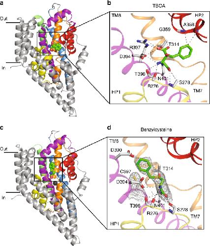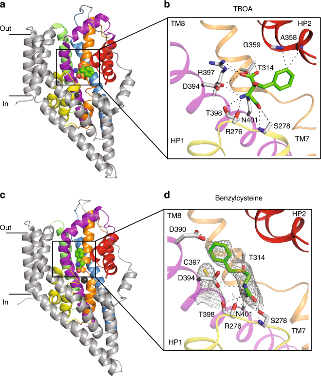 Fig. 6. Inhibitor-binding site in wild-type and mutant GltPh. View of a single protomer of the wild-type GltPh bound to TBOA (PDB:2NWW, a and GltPh-R397C bound to benzylcysteine c. The protomer is divided into the ‘scaffold domain’ (TM1, TM2, TM4 and TM5, coloured in grey) and the ‘transport domain’ (TM3 in blue, TM6 in green, TM7 in orange, TM8 in magenta, HP1 in yellow and HP2 in red). Bound inhibitor is shown in stick representation and Na1 and Na2 are shown as dark grey spheres. Close-up view of the TBOA b and benzylcysteine d binding sites. Interactions within 3.5 Å between bound inhibitor and residues in the GltPh binding site are shown as dashed lines. Averaged 2fo–fc electron density maps at 1σ in dark grey mesh are shown for benzylcysteine and C397