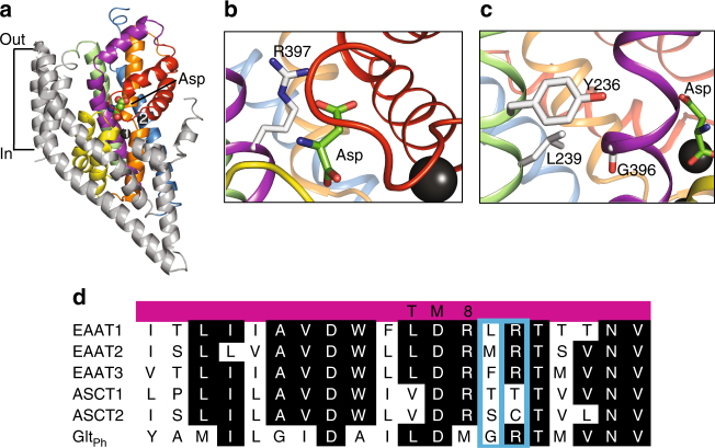 a GltPh protomer (PDB: 2NWX) shown in the plane of the membrane, with the trimerization domain (TM1, 2, 4 and 5) in grey and the transport domain: TM3 (blue), TM6 (green), TM7 (orange), TM8 (purple), HP1 (yellow) and HP2 (red). L-Aspartate and two bound Na+ ions (dark grey spheres) are shown. Close-up view of the substrate-binding site is shown with b R397 and c Y236, L239 and G396 shown in stick representation. In c, the protein has been rotated for better visualisation of the TM3 and TM6 interface. Images were made using Pymol64. d Sequence alignment of part of TM8 in EAAT1-3, ASCT1-2 and GltPh, where conserved residues are highlighted in black, and mutated residues are highlighted by blue boxes