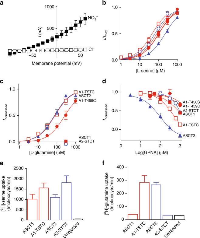 −-containing buffer (closed squares), at pH 7.5 in wild-type ASCT1. Concentration–response curves are shown for L-serine b and L-glutamine c in ASCT1 (red, closed squares), ASCT2 (blue, closed triangles), A1-T458S (red diamonds), A1-T459C (red, closed circles), A1-T458S/T459C (red, open squares) and A2-S481T/C482T (blue, open circles) at+60 mV. As L-glutamine concentration–response curves for ASCT1, A1-T458S and A2-S481T/C482T was not determined, data were normalised to the predicted maximal current for L-serine for each transporter. d Concentration–response curves are shown for GPNA in ASCT1 (red, closed squares), ASCT2 (blue, closed triangles), A1-T459C (red, closed circles), A1-T458S (red diamonds), A1-T458S/T459C (red, open squares) and A2-S481T/C482T (blue, open circles). GPNA was co-applied with an EC50 value of L-serine for the respective transporters and normalised to the current generated by the application of L-serine alone. L-[3H]serine e and L-[3H]glutamine f uptake into oocytes expressing wild-type and mutant ASCT1 (red), ASCT2 (blue) transporters and uninjected control oocytes (black). Oocytes were incubated in Cl−-containing buffer with 10 µM L-[3H]substrate at room temperature, pH 7.5 for 10 min. Values presented are mean ± S.E.M, (n ≥ 3)