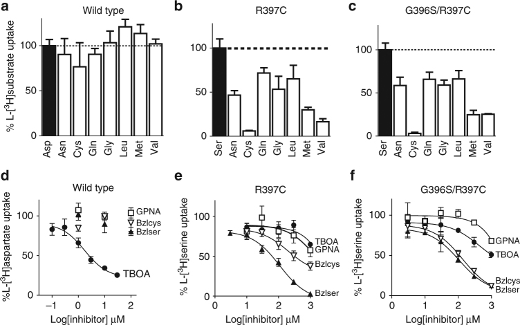 d, GltPh-R397C e and GltPh-G396S/R397C f. Values shown represent mean ± SEM, n ≥ 3