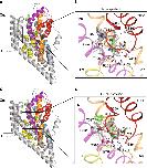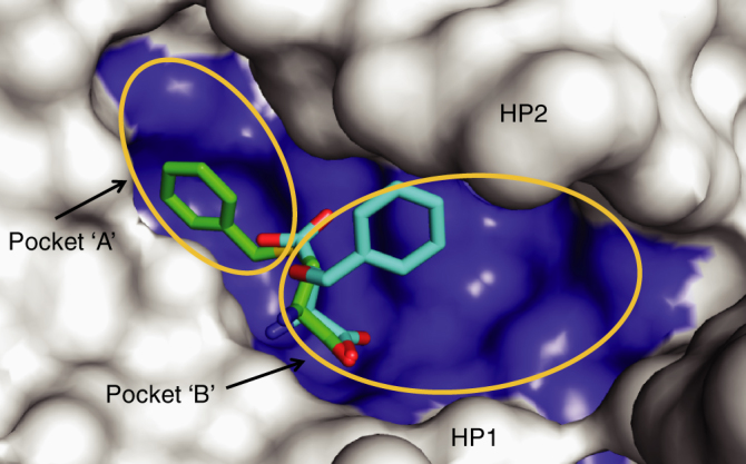 Fig. 7. Binding pocket of GltPh-R397C Surface representation of the binding pocket of GltPh-R397C bound to benzylcysteine (green sticks). TBOA bound to GltPh (PDB:2NWW; cyan sticks) is superimposed in the binding site. ‘Pocket A’ and ‘Pocket B’ indicated by orange circles