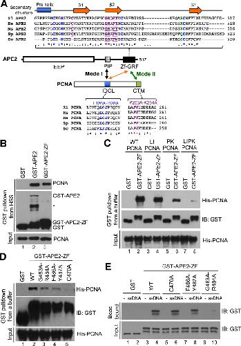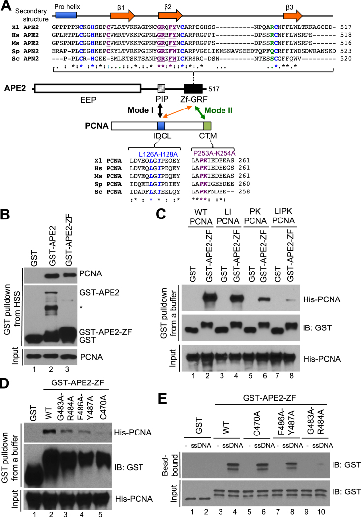 Figure 5. APE2 Zf–GRF interacts with PCNA as the second mode of APE2–PCNA interaction. (A) Schematic diagram of APE2 Zf–GRF region and the IDCL and CTM regions of PCNA. (B) GST pulldown assays with GST, GST-APE2 and GST-APE2-ZF from HSS. The input and pulldown samples were examined via immunoblotting analysis. (C) GST pulldown assays with GST or GST-APE2-ZF as well as WT/mutant PCNA (i.e., LI PCNA, PK PCNA, or LIPK PCNA) in an interaction buffer. The input and pulldown samples were examined via immunoblotting analysis. (D) GST pulldown assays with GST or WT/mutant GST-APE2-ZF (i.e., G483A-R484A, F486A-Y487A, or C470A) as well as WT His-tagged PCNA in an interaction buffer. The input and pulldown samples were examined via immunoblotting analysis. (E) Biotin-coupled ssDNA (80nt) was coupled to streptavidin dynabeads and utilized for protein–DNA interaction assays with GST or WT/mutant GST-APE2-ZF (i.e., G483A-R484A, F486A-Y487A or C470A) in an interaction buffer. The input and bead-bound fractions were analyzed via immunoblotting analysis.