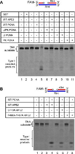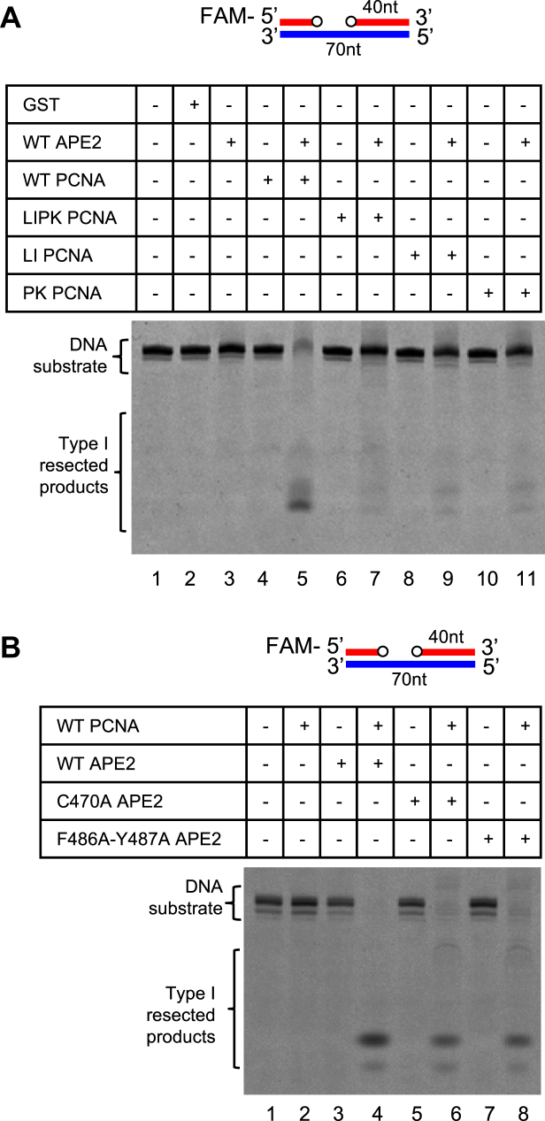 Figure 7. Exonuclease activities of APE2 with purified proteins in vitro. (A) In vitro analysis of exonuclease activity of GST-APE2 with the presence or absence of WT or mutant His-tagged PCNA using the FAM-labeled gapped dsDNA structure. (B) In vitro analysis of exonuclease activity of WT and mutant GST-APE2 with the presence or absence of WT His-tagged PCNA using the FAM-labeled gapped dsDNA structure.