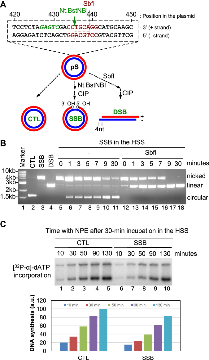 Figure 1. A defined site-specific SSB structure can be repaired in the Xenopus HSS system. (A) Schematic diagram of generating SSB and DSB plasmid structures. (B) The defined SSB structure is gradually repaired in HSS system. SSB repair intermediate products from HSS system were isolated at different time points and treated by SbfI, followed by examination via agarose gel electrophoresis. (C) (Top) CTL or SSB plasmid was added to HSS, which was supplemented with [32P-α]-dATP, for a 30-min incubation. Then NPE was added for continuous incubation for different time as indicated and samples were examined on agarose gel. (Bottom) Quantification of DNA synthesis of CTL or SSB plasmid in the HSS/NPE system shown in the top.
