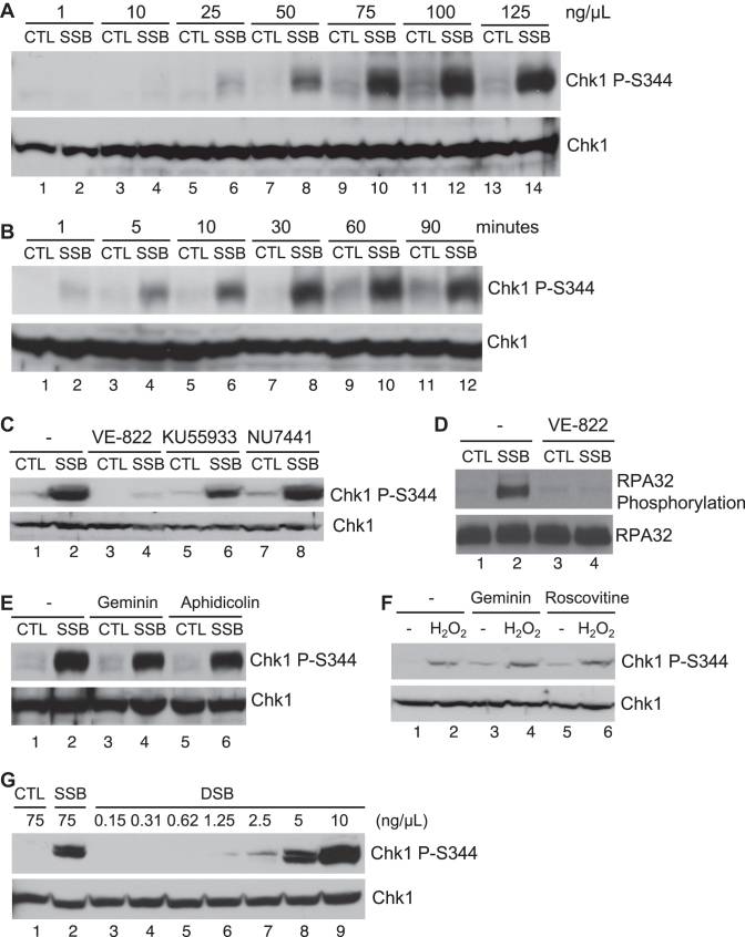 Figure 2. An ATR–Chk1 DNA damage response pathway is induced by the defined SSB structure in the HSS system. (A) CTL or SSB plasmid was added to HSS at different concentrations as indicated, and incubated for 30 min. Extracts were examined via immunoblotting analysis for Chk1 phosphorylation (i.e., Chk1 P-Ser344) and total Chk1. (B) CTL or SSB plasmid was added to HSS at a final concentration of 75 ng/μl. After different time of incubation at room temperature, the extracts were examined via immunoblotting analysis. (C–E) ATR inhibitor VE-822, ATM inhibitor KU55933, DNA-PK inhibitor NU7441, recombinant geminin, or DNA polymerase inhibitor Aphidicolin was added to HSS supplemented with CTL or SSB plasmid at a final concentration of 75 ng/μl for 30 min. Extracts were examined via immunoblotting analysis as indicated. (F) Geminin or roscovitine was added to HSS supplemented with sperm chromatin and hydrogen peroxide. After a 45-min incubation, extracts were examined via immunoblotting analysis as indicated. (G) CTL, SSB or DSB plasmid was added to HSS at different concentrations as indicated. Samples were examined via immunoblotting analysis.