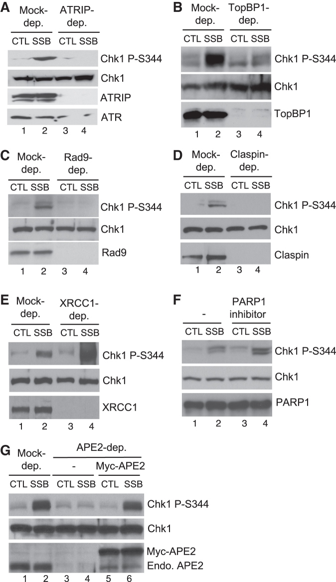 Figure 3. APE2 is required for checkpoint signaling from the defined SSB structure in the HSS system. (A–E) CTL or SSB plasmid was added to mock-, ATRIP-, TopBP1-, Rad9-, Claspin-, or XRCC1-depleted HSS, respectively, at a concentration of 75 ng/μL for 30 min. Extracts were examined via immunoblotting analysis, as indicated. (F) PARP1 specific inhibitor (4-amino-1,8-naphthalimide, 0.1 mM) was added to HSS supplemented with CTL or SSB plasmid. Extracts were examined via immunoblotting analysis. (G) Recombinant Myc-APE2 was added to APE2-depleted HSS supplemented with CTL or SSB plasmid. Extracts were examined via immunoblotting analysis. ‘Endo. APE2’ represents endogenous APE2.