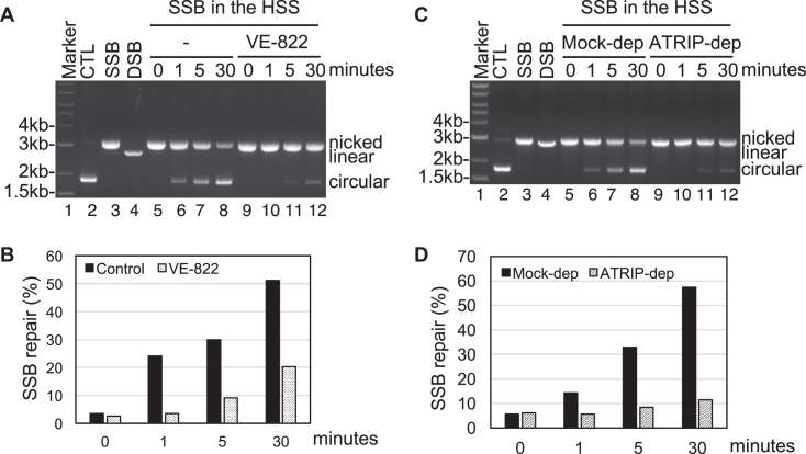 Figure 4. The SSB-induced ATR DDR pathway is essential for SSB repair. (A) SSB plasmid was added to HSS with or without VE-822 for different time as indicated. SSB repair products were isolated and examined on agarose gel (Ethidium bromide staining). (B) Quantification of SSB repair capacity (circular/(circular + nicked) × 100) with or without VE-822 treatment in the HSS system from (A). (C) SSB plasmid was added to mock- or ATRIP-depleted HSS for different time as indicated. SSB repair products were isolated and examined on agarose (Ethidium bromide staining). (D) Quantification of SSB repair capacity in mock- or ATRIP-depleted HSS system from (C) using a similar method described in (B).