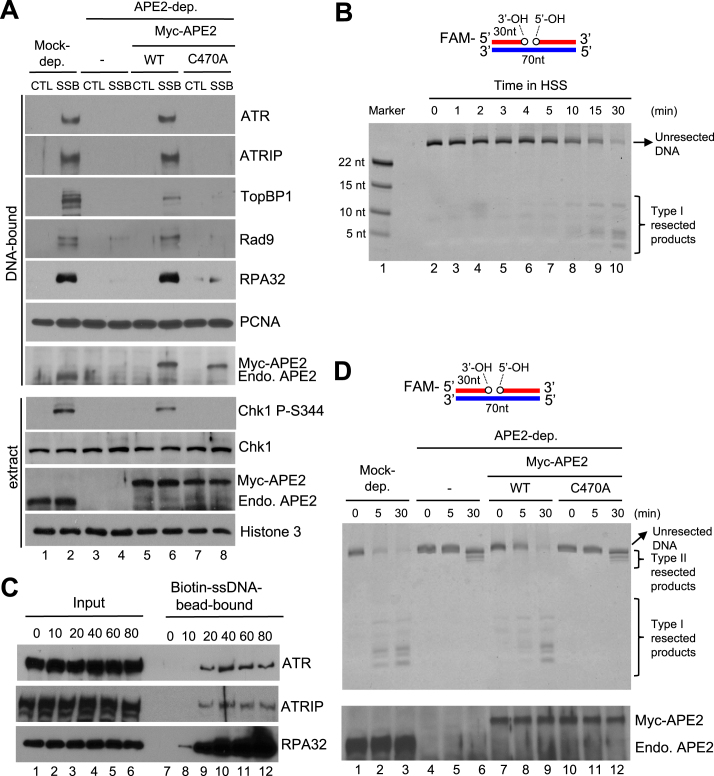 Figure 6. APE2 Zf–GRF–PCNA interaction promotes SSB end resection, the assembly of a checkpoint protein complex onto SSB plasmid, and Chk1 phosphorylation in the HSS system. (A) CTL or SSB plasmid was added to mock- or APE2-depleted HSS, which was supplemented with WT or C470A Myc-APE2. DNA-bound fractions and total extract samples were examined via immunoblotting analysis as indicated. ‘Endo. APE2’ represents endogenous APE2. (B) FAM-labeled dsDNA with a site specific SSB (designed as FAM-SSB) was added to HSS for different time as indicated. Then samples were examined via TBE-Urea gel and visualized via Typhoon imager. ‘Marker’ represents four FAM-labeled different-length ssDNA. (C) The length dependence of ssDNA for the recruitment of ATR-ATRIP complex and RPA to ssDNA in the HSS. Streptavidin Dynabeads coupled with different length of Biotin-coupled ssDNA (i.e., 0, 10, 20, 40, 60 or 80nt) were added to HSS. After incubation, the Biotin-ssDNA bead-bound fractions were isolated from HSS. The Input and bead-bound fractions were examined via immunoblotting analysis. (D) The FAM-SSB substrate was added to mock- or APE2-depleted HSS, which was supplemented with WT or C470A Myc-APE2. DNA structures were examined via TBE-Urea gel and visualized via Typhoon imager (top). Samples were also analyzed via immunoblotting analysis as indicated. ‘Endo. APE2’ represents endogenous APE2 (bottom).