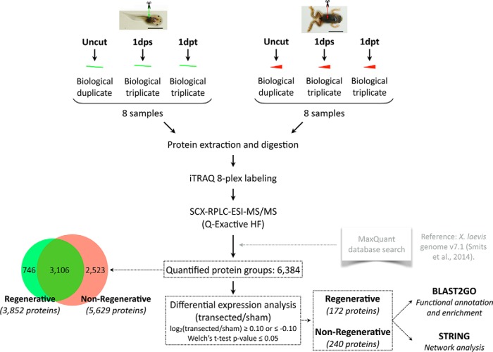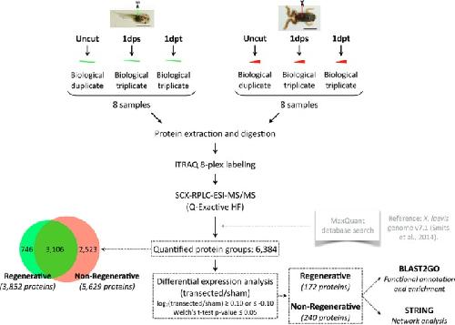 Fig. 1. Experimental workflow. One iTRAQ 8-plex experiment for each stage (regenerative, left; nonregenerative, right) was performed, including duplicate uncut samples, and triplicate sham (1dps) and transected (1dpt) samples isolated 1 day after surgery. Two iTRAQ channels were used for labeling of duplicate uncut samples. Three iTRAQ channels were used for labeling of triplicate sham (1dps) samples, and the remaining three channels for triplicate transected (1dpt) samples. Approximately 0.95 million tandem mass spectra were acquired, which corresponded to over 50,000 peptide sequences, and 7859 identified protein groups. 6384 had quantifiable levels, corresponding to 3852 proteins in the regenerative stage, and 5629 proteins in the nonregenerative stage (overlap: 3106 proteins quantified in both stages). Analysis identified 172 differentially expressed proteins in the regenerative stage, and 240 proteins in the nonregenerative stage. Functional analyses were performed using BLAST2GO and STRING for differentially expressed proteins.