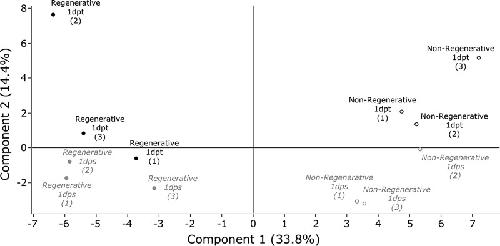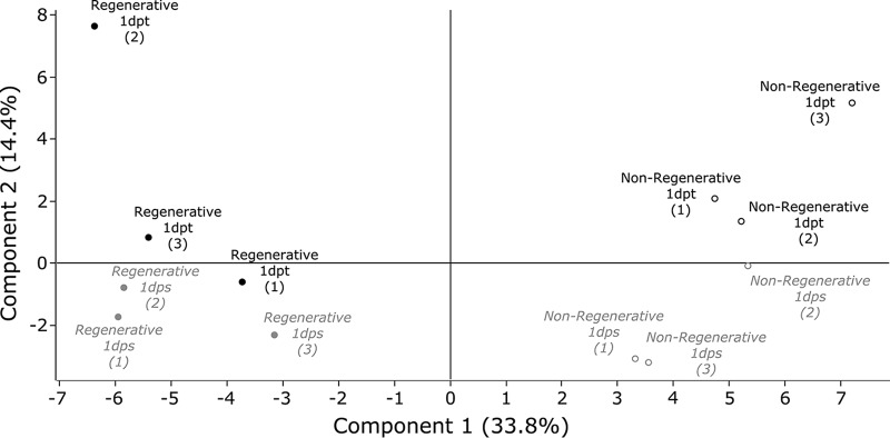 Fig. 2. Principal Component Analysis. Reporter ion intensities for transected and sham operated samples were normalized against uncut samples, and principal component analysis performed on normalized values. Regenerative (●) and nonregenerative stage (○) samples were separated along component 1, and 1 day after transection (1dpt, black) and 1 day after sham-operation (1dps, gray) samples separated along component 2. Percentages (%) indicate the percentage of variance that each principal component represents.