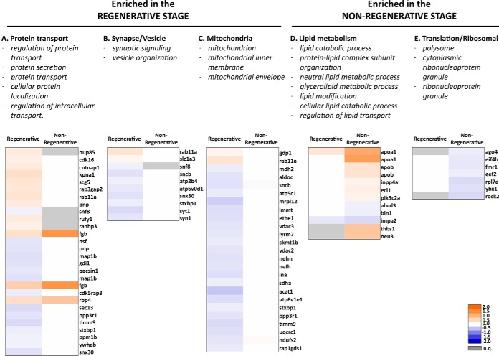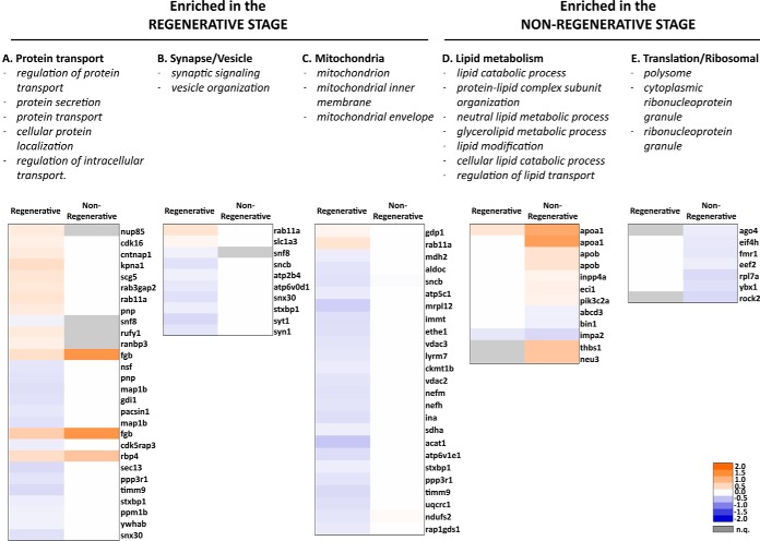 Fig. 5. Heatmaps showing differential expression changes for proteins belonging to enriched gene ontology (GO) categories. Gene ontology terms were classified into 5 groups (A–E). Specific GO terms included in each group are listed below. n.q. protein was not quantified (gray boxes). Color scale represents log2 (transected/sham) fold-change values with significant differential expression (p value < 0.05). Fold-changes with nonsignificant p value (≥ 0.05) are shown in white.