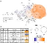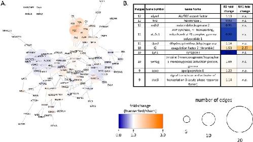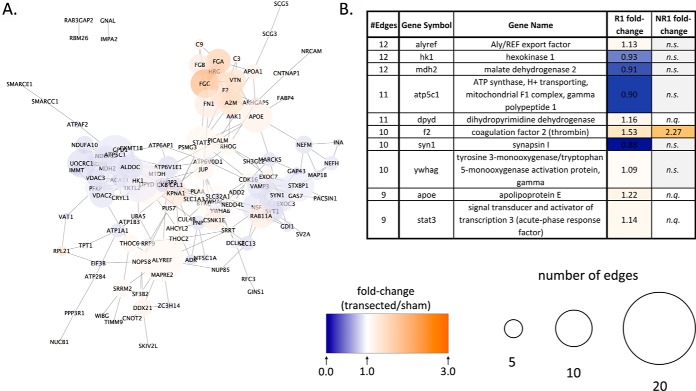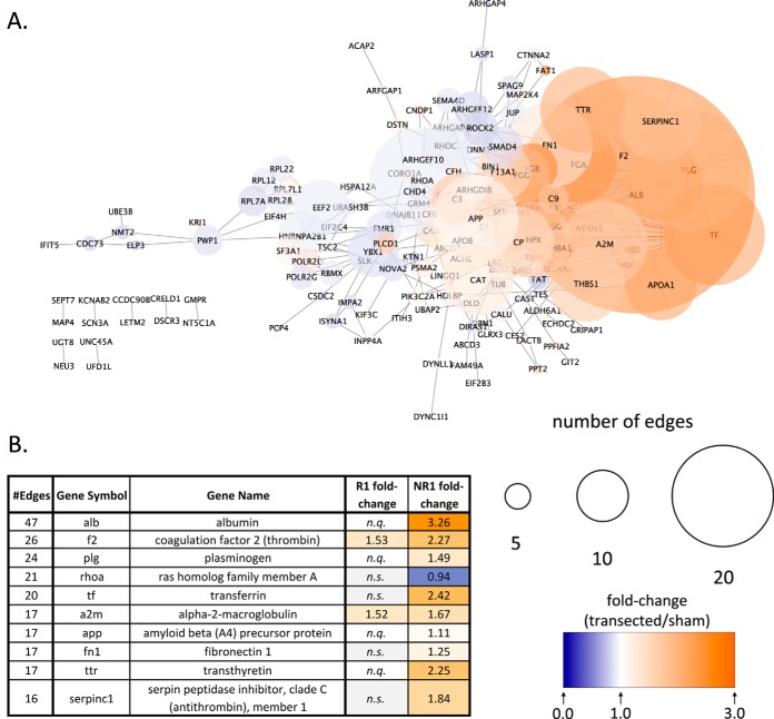Fig. 6. STRING network analysis for differentially expressed proteins in the R-stage. STRING network analysis for proteins meeting differential expression criteria (see Fig. 3 legend) in the regenerative stage. A, STRING network. Fill color represents fold-change, and node size represents the number of edges (or undirected connections) each protein has. B, List of most highly connected proteins and their See both scales in bottom-right corner.