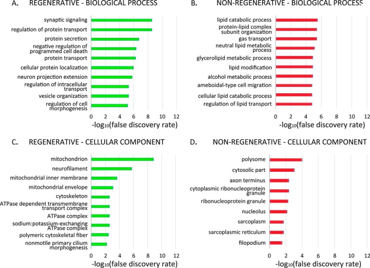 Fig. 4. Gene ontology enrichment for differentially expressed proteins in the regenerative and nonregenerative stage. Gene ontology (GO) enrichment analysis was performed for proteins meeting differential expression criteria (see Fig. 3 legend) using Fisher's Exact Test, reporting terms with a false discovery rate (FDR) < 0.05. In these graphs, terms were additionally filtered so that only terms exclusively found in one stage but not the other are shown. Top 10 categories with the lowest FDR are shown when more than 10 exclusive GO terms were found.