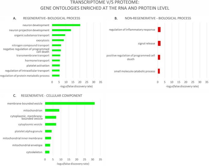 Fig. 8. Gene ontology (GO) categories enriched at both the transcriptome and proteome levels. A list of GO terms enriched among differentially expressed genes, in both previously published RNA-Seq data (8) and the present iTRAQ data was generated, after which level 5 GO terms were selected and their enrichment false discovery rate (FDR) value obtained from iTRAQ data. As in Fig. 4, terms were also filtered to include only level 5 terms exclusively found in either stage. When more than 10 exclusive GO terms were found, only the top 10 with the lowest FDR value were included in the graph (see Table I and supplemental data 6 for additional information). Note: cellular component for the nonregenerative stage is not shown because there were no level 5 terms exclusively found in this stage in this analysis.
