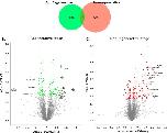 Fig. 3. Proteins showing differential expression when comparing transected and sham-operated animals. Differentially expressed proteins were determined using a Welch's t test (p value < 0.05) and an additional log2 (transected/sham) ≥ 0.10 or ≤ −0.10 fold-change filter. A, Venn diagram showing the number of proteins meeting differential expression criteria for each stage, distributed into those which did so in the regenerative, nonregenerative stage, or both. B, C, Volcano plots showing log2 (transected/sham) fold-change (x-axis) and -log10 (p value) (x-axis) for all quantified proteins in the regenerative (B) or the nonregenerative stage (C). Colored dots indicate proteins meeting differential expression criteria, and labels show gene symbols for top 15 proteins with highest fold-change. Regenerative- green; nonregenerative- red.
