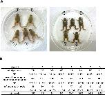 Fig. 6. F1 trβ mutants accomplish natural metamorphosis. (A) Image of F1 offspring produced by mating of the F0 crispants. (B) Mutation sequences from each F1 offspring. PCR products of trβ target site from six F1 froglets were subcloned and sequenced. Sequences highlighted in red and gray denote protospacer adjacent motif (PAM) and protospacer sequence, respectively. Splice donor site is underlined. The deleted and inserted nucleotides are shown by dashes and blue letters, respectively. Capital and small letters indicate exon and intron, respectively.